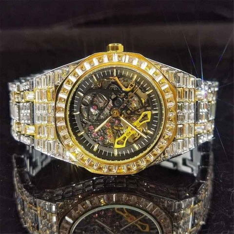 Montre-bracelet automatique Bling de qualité supérieure pour hommes femmes Baguette glacée CZ mouvement mécanique noir bande en acier inoxydable rappeur bijoux